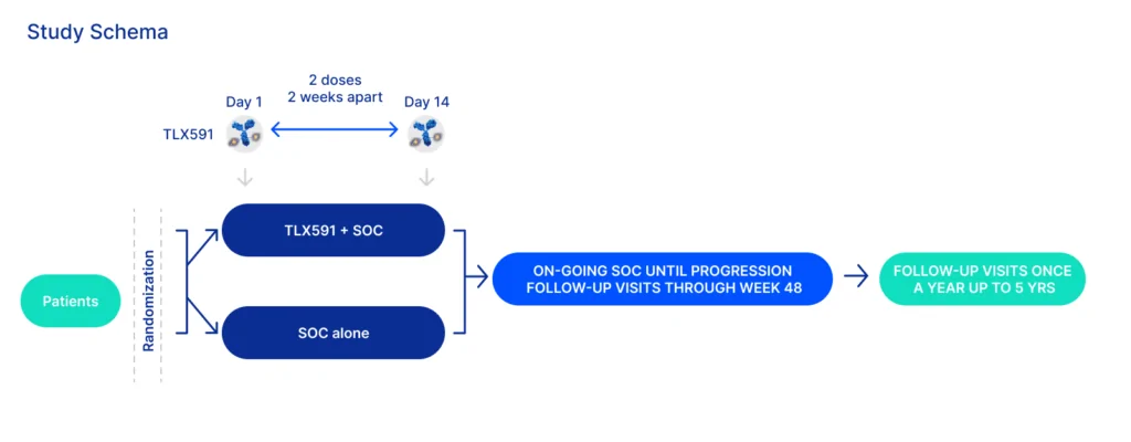 This study will be completed in 2 parts. Participants in Part 1 of the study, which has now been completed, received TLX591 + SOC. Participants in Part 2 of the study will be assigned randomly (by chance not choice) to receive either TLX591 + SOC, or SoC alone.